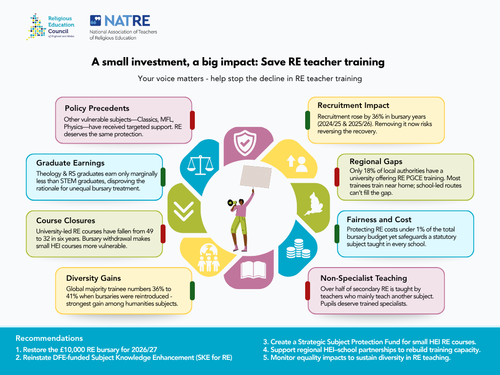 The Department for Education has announced that the £10,000 Initial Teacher Training (ITT) bursary for Religious Education will be withdrawn from 2026–2027. This decision will deepen the national shortage of RE teachers and seriously threaten the future of the subject.